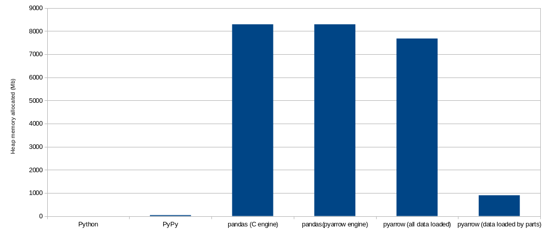 This solution will take around 50 seconds, around 70% of the time taken by the pandas with PyArrow engine implementation. And the memory required at the peak is 7.5 Gb (93% of the required by the pandas/PyArrow implementation).