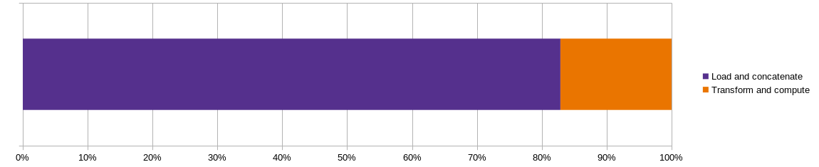 This solution is faster, it takes around 37 seconds (74% of the time it took loading all the data at once). The time to read the files should stay the same, and the time to compute the operations should be slightly slower, since there are synergies in operating with all data at once. But the main difference should be in the concatenation that we do not perform anymore. That operation requires allocating memory and moving data, which are slow operations.